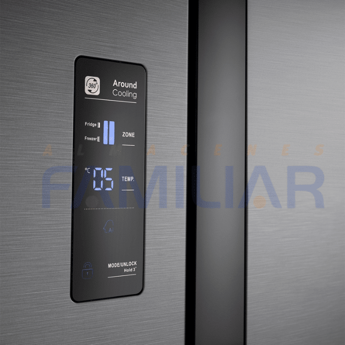 REFRIGERADORA INDURAMA RI-760 SIDE BY SIDE BASICA de Indurama combina amplitud, tecnología inteligente y diseño sofisticado. Equipada con AI FreshSense, monitorea automáticamente las condiciones internas mediante sensores y algoritmos, preservando la frescura óptima de tus alimentos. Su acabado en lámina inoxidable anti‑huella garantiza un aspecto limpio y elegante con mínimo mantenimiento.